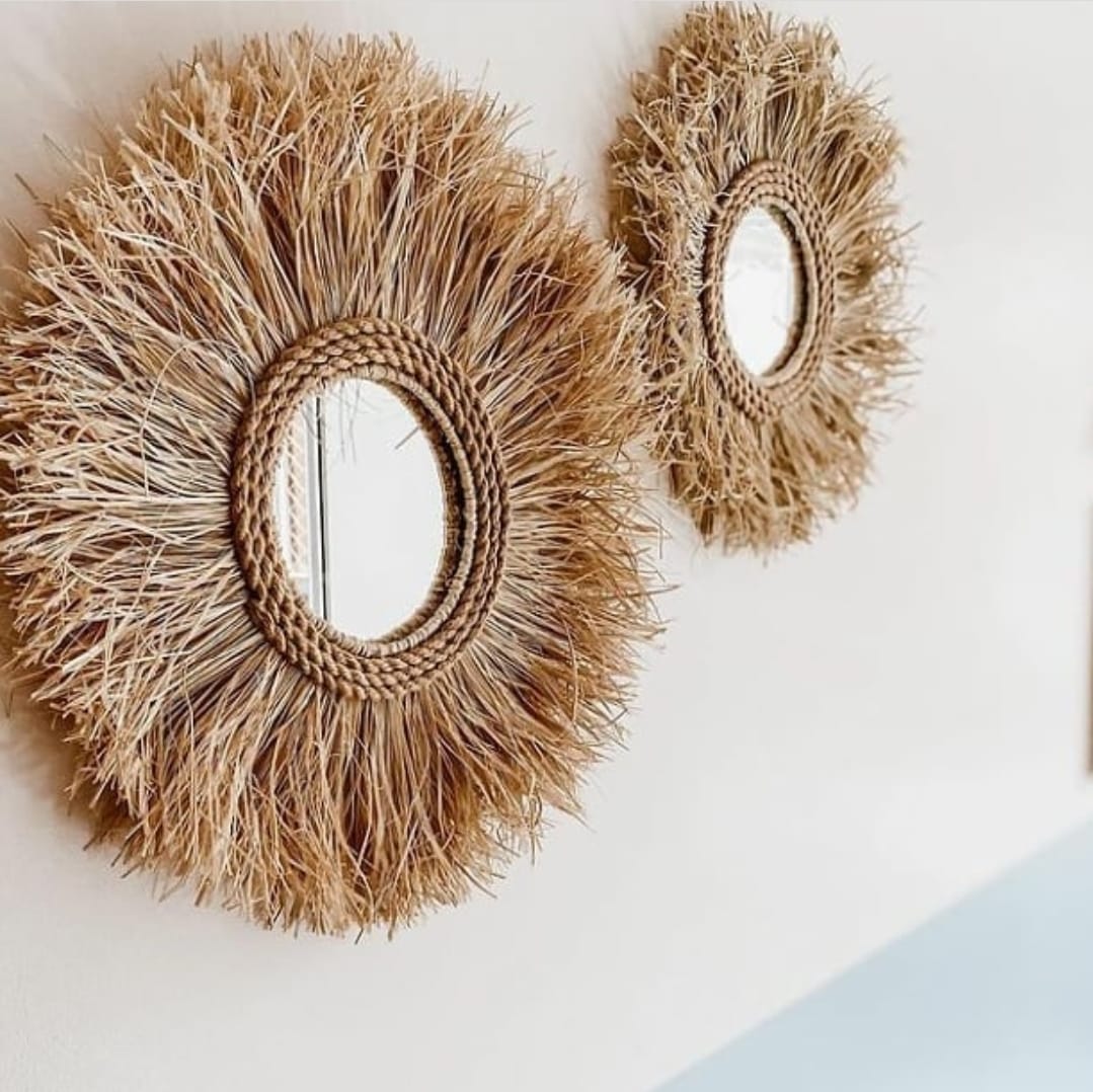 Peça com 48 cm de diâmetro/meio do espelho com 20 cm. Detalhe em fibra de cancamo e composição de Rafia natural.